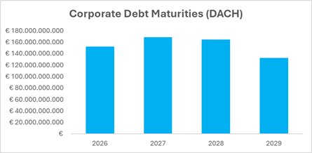 Unternehmen in Deutschland, Österreich und der Schweiz stehen vor einer enormen Refinanzierungsaufgabe. Laut aktuellen Bloomberg Daten (siehe nachfolgende Grafik) summieren sich die bis 2030 fälligen Unternehmensschulden in der DACH-Region auf über EUR 614 Mrd. Allein im Jahr 2026 werden davon etwa EUR 151 Mrd.  fällig. Diese Konzentration führt zu einer Refinanzierungswelle bzw. Maturity Wall, die sich insbesondere in den Jahren 2026 bis 2028 bemerkbar machen wird.