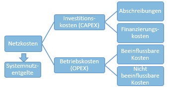 Die Netzentgelte werden durch die Netzkosten bestimmt, welche wiederum regulatorisch klar geregelt sind. Die Kostenbasis wird wie folgt aufgeschlüsselt: