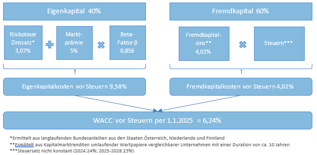 Netzbetreiber haben in ihrer tatsächlichen Kapitalstruktur zwar Gestaltungsspielraum, allerdings mit klaren regulatorischen Grenzen: Bei einer Eigenkapitalquote zwischen 36% und 40% wird für die Berechnung pauschal eine Quote von 40% zugrunde gelegt. Fällt der Eigenkapitalanteil unter 36 %, so wird der WACC auf Basis der tatsächlichen Kapitalstruktur berechnet, welcher den regulatorisch anerkannten Kapitalkostenersatz reduziert. Liegt der Eigenkapitalanteil über 40 %, gibt es hingegen keine Erhöhung des WACC – d. h. eine höhere Eigenkapitalquote bringt dem Unternehmen regulatorisch keinen Vorteil. Nur der regulatorisch anerkannte Kapitalkostenersatz kann an Endverbraucher weiterverrechnet werden.3