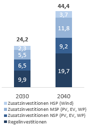 - Enormer Investitionsbedarf bis 2040 in das Übertragungsnetz (ca. EUR 9 Mrd.) und Verteilernetz (ca. EUR 44,4 Mrd.), dies entspricht einem Finanzierungsbedarf von rund EUR 53 Mrd.